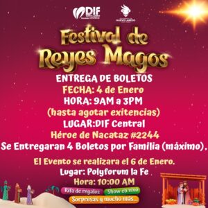 Los boletos estarán disponibles a partir del 4 de enero en las instalaciones del DIF, ubicadas en Héroe de Nacataz 2244, Fraccionamiento Ojo Caliente. Se distribuirán en horario de 9:00 AM a 3:00 PM, hasta agotar existencias.