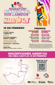 El Gobierno Municipal te invita a participar en el emocionante “Maratón Binacional Dos Laredos”, una carrera de 42 kilómetros que unirá a dos naciones en un evento deportivo sin precedentes. Esta competencia, única en el mundo, será un hito en la región fronteriza.