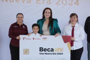 En un emotivo evento llevado a cabo este miércoles, la alcaldesa Carmen Lilia Canturosas Villarreal realizó la entrega simbólica de la Beca Una Nueva Era 2024 a los estudiantes de la escuela primaria “Profr. Rafael Ramírez”.