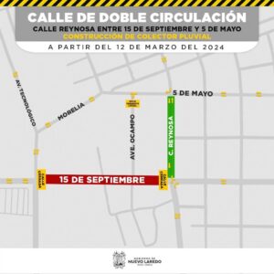 A partir del 12 de marzo, se implementará un cambio en la vialidad en la calle Reynosa, entre las calles 15 de Septiembre y 5 de mayo, la cual estará habilitada en doble sentido.