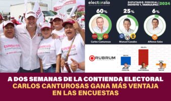 Los resultados de la empresa RUBRUM reflejan una diferencia de 26 puntos a favor del abanderado de los partidos MORENA, PT y Verde Ecologista, Carlos Canturosas, quien tiene el 56% de la aprobación ciudadana, mientras que el contendiente del PRIAN, Manuel Canales, apenas cuenta con el 30%.