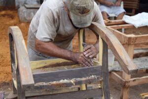 Su experiencia le ha permitido trabajar piezas como mecedoras, cuya materia prima es principalmente madera de mezquite y ébano, aunque también trabaja el pino y el cedro, creando desde utensilios de cocina hasta muebles más elaborados a petición del cliente; artículos promovidos para su venta a través de la Secretaría de Seguridad Pública de Tamaulipas (SSPT).