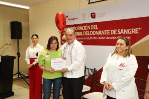 En el evento, que se llevó a cabo en las instalaciones del Banco de Sangre de esta ciudad, se dio un agradecimiento especial a las y los donantes voluntarios de instituciones como la Universidad Autónoma de Tamaulipas, la Universidad Politécnica de Victoria, el 77 Batallón de Infantería, así como a la Asociación Civil Voluntad contra el Cáncer, por el apoyo que cada año y en cada campaña se tiene de ellos.