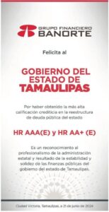 «Es un reconocimiento al profesionalismo de la administración estatal y resultado de la estabilidad y solidez de las finanzas públicas del Gobierno del Estado de Tamaulipas», expresó Banorte.