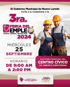 El Gobierno Municipal de Nuevo Laredo extiende una invitación a la ciudadanía para participar en la Tercera Feria del Empleo 2024, la cual se llevará a cabo el miércoles 25 de septiembre en el Centro Cívico «Carlos E. Cantú Rosas».