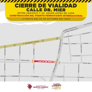 Posteriormente, la calle Doctor Mier, en el sector del Paso a Desnivel, será cerrada a la circulación del 3 al 7 de octubre. La dependencia recomienda a los automovilistas que transiten hacia el cruce Sentri, en el Puente I, tomar rutas alternas. La sugerencia es circular por la avenida César López de Lara, seguir hasta la calle Mina y doblar en la avenida Obregón para conectarse nuevamente con el bulevar 15 de Junio.