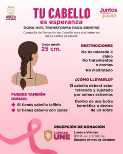 Como parte de las actividades del mes de octubre en conmemoración del Mes de Sensibilización sobre el Cáncer de Mama, el Gobierno Municipal de Nuevo Laredo, liderado por la alcaldesa Carmen Lilia Canturosas Villarreal, hace un llamado solidario a la ciudadanía para sumarse a una causa especial: la donación de cabello en favor de personas que han sido diagnosticadas con cáncer. Esta iniciativa tiene como objetivo la creación de pelucas que serán entregadas a niños, adolescentes y adultos que han perdido su cabello debido a los tratamientos oncológicos.