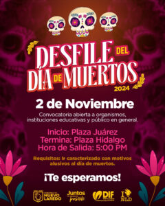 La Dirección de Turismo hace una invitación a toda la comunidad, instituciones educativas y organismos locales a unirse al primer Desfile del Día de los Muertos en Nuevo Laredo, el próximo 2 de noviembre. Este evento busca celebrar y preservar una de las tradiciones más emblemáticas de México, invitando a los participantes a sumarse en una experiencia que honra a nuestros antepasados y la rica cultura mexicana.