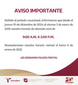 Ciudad Victoria, Tamaulipas.- Con el propósito de garantizar la continuidad en la atención de los servicios jurídicos, las oficinas del Instituto de la Defensoría Pública, operarán en un horario especial durante el periodo vacacional comprendido del 19 de diciembre al 3 de enero de 2025, informó la directora general del instituto, Mariela Estefanía Zurita Lugo.