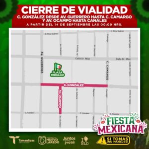 El Gobierno Municipal de Nuevo Laredo, a través de la Dirección de Tránsito y Vialidad, informa a la ciudadanía que, con motivo de los preparativos para la celebración del Grito de Independencia 2025, será necesario llevar a cabo el cierre temporal de un importante tramo vial en la zona centro de la ciudad.