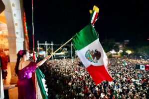 En el momento más esperado de la noche, la alcaldesa Carmen Lilia salió al balcón del Palacio Federal para ondear la Bandera Nacional y dar el tradicional grito.